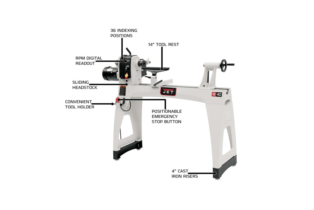 JWL-1840EVS профессиональный токарный станок новой линейки JET, при его разработке были учтены все актуальные запросы современных мастеров-деревообработчиков. Модель имеет межцентровое расстояние 1000мм, а главное отличие в диаметре обточки над станиной 18 дюймов/470 мм . Для уверенной работы с более крупными деталями станок JWL-1840EVS оснащен двигателем повышенной мощности. Важное достоинство новой модели – возможность перенастройки для удобной работы с деталями большого диаметра. Переднюю бабку можно поворачивать вокруг вертикальной оси, фиксация подпружиненным штифтом предусмотрена через каждые 30°. Благодаря такой возможности можно разместить обрабатываемую деталь на планшайбе или в патроне сбоку от станины. Подручник при этом можно оснастить дополнительной горизонтальной секцией-вставкой (штатная комплектация), расширяющей диапазон настроек его положения.
