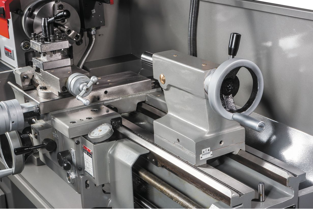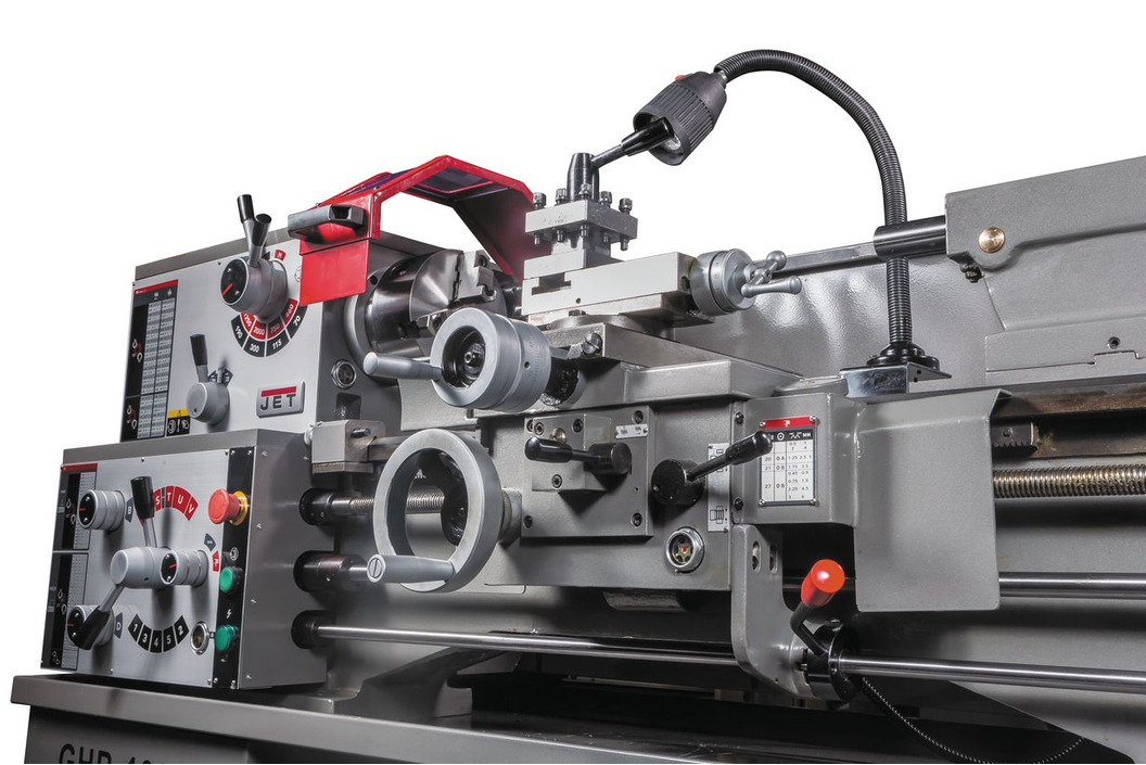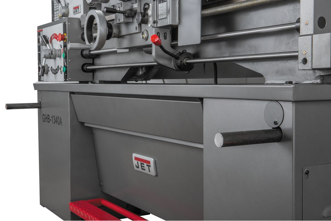 Многофункциональный токарный станок GHB-1340A - один из самых популярных в линейке профессионального оборудования компании JET. Он предназначен для установки в мастерских, ремонтных подразделениях предприятий, автосервисах. Также GHB-1340 A может использоваться и частными мастерами - продвинутыми специалистами в обработке металла.Станок выпускается по протоколу DIN 8606, что гарантирует соблюдение допусков и параметров на всех стадиях производства, а также подтверждает обязательную гарантию в странах Таможенного союза. На станке можно обрабатывать заготовки диаметром 330 мм над станиной и 197 мм над суппортом на скоростях 70 - 2000 об/мин.В отличии от младших станков в линейке, на GHB-1340A увеличено расстояние между центрами, что дает возможность обрабатывать заготовки длинною до 1000 мм. Для работы станка потребуется сеть 380В. Как и все токарное оборудование производителя, на данном станке используются направляющие, которые закаляются токами высокой частоты, а затем тщательно шлифуются. Такое технологическое решение позволяет повысить точность обработки и продлить ресурс изделия в целом. Механизм привода шпинделя станка помещен в масляную ванну, что позволяет добиться оптимального охлаждения и снизить шум. Конструктивно станок выполнен по двухвинтовой схеме: ходовой винт обеспечивает нарезание резьбы, а ходовой вал за точение в режиме автомат. Для облегчения механического переключения режимов работы предусмотрен толчковый (кратковременный) запуск электродвигателя.